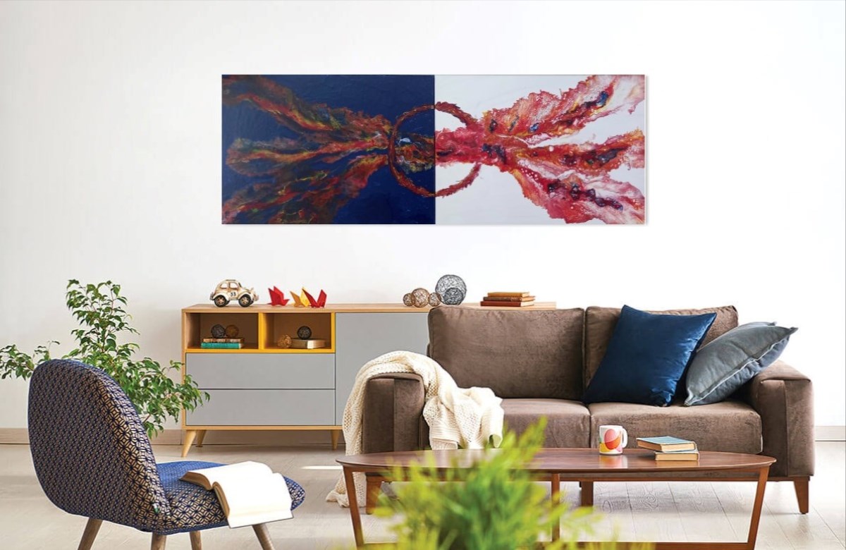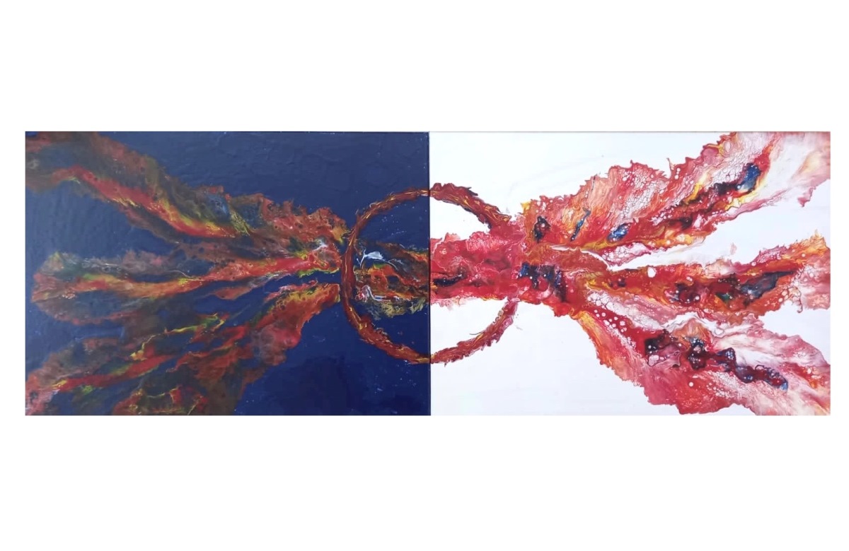 Composition of double pouring acrylic painting on canvas.