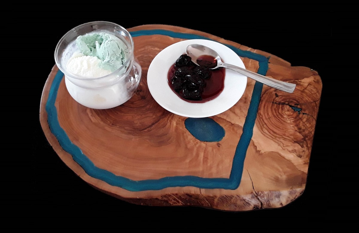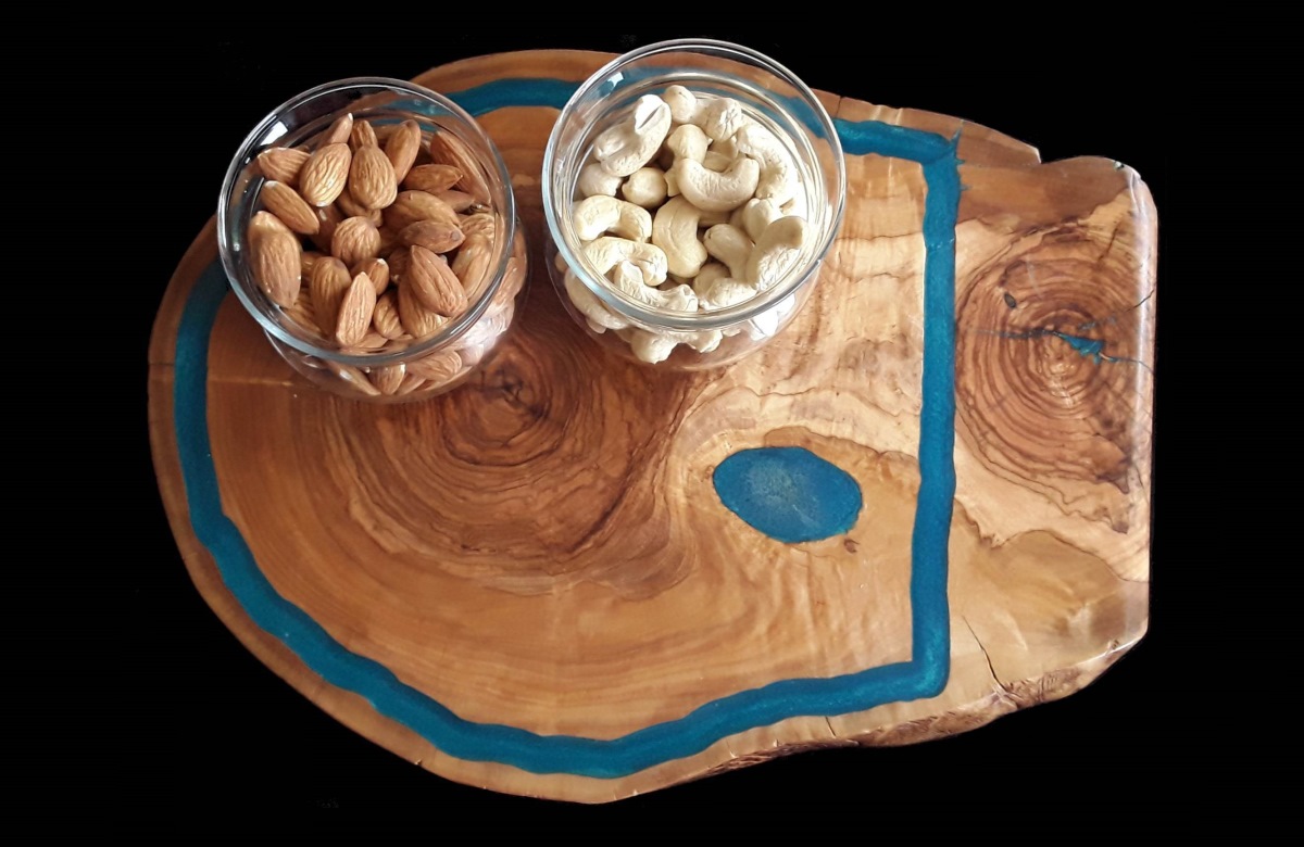 Unique serving dish made of resin and olive wood.