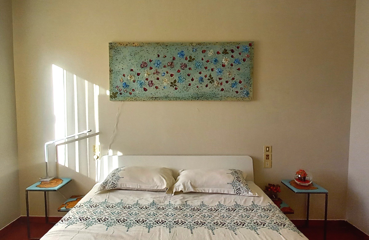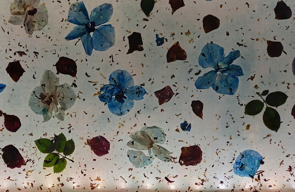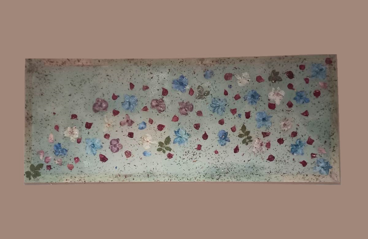 An exceptional wall frame with flowers and resin on linen fabric. A led strip at the back side illuminates your bedroom with a soft light.